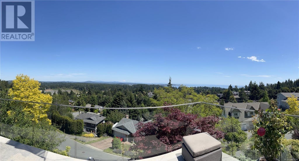 Experience elevated west coast living in this custom-built 2016 home offering stunning panoramic views of downtown Victoria, the Juan de Fuca Strait, and the Olympic Mountains. With over 3,200 sq ft of finished space, this 2-level residence is designed for flexibility, comfort and multigenerational living. Upper Level: The heart of the home features soaring 12-foot ceilings, a dramatic waterfall quartz island, 5-burner natural gas stove, and a modern water fireplace anchoring the open-concept living area. This level also includes the kitchen, dining area, home office, powder room, laundry room, and a spacious primary bedroom with a walk-in closet and a beautifully appointed en-suite. Lower Level: Perfect for guests, family, or private retreat, the lower level offers a second primary bedroom with ensuite, a third bedroom, and a versatile media room currently used as a hot yoga studio. A dedicated wine room and adjacent mechanical room provide added function and storage. Additional features include 4 bathrooms in total, a oversized double car garage, and the balance of the new home warranty. Located in a peaceful enclave, this home delivers breathtaking views, refined finishes, and thoughtful design throughout. (id:6289)