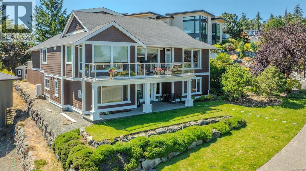 Unrivalled panoramic views in prestigious Glen Oaks Estates! This spectacular 3 bed 3bath + den, 3250 sq ft home captivates with 9ft ceilings, and oversized windows showcasing sweeping ocean island vistas! The main level features a designer kitchen that's an entertainer's delight, with upgraded appliances, a large granite island, and upgraded wood cabinetry. Upgraded millwork detail, elegant hardwood, and quality finishing features inspire comfort. The hotel-inspired primary suite is a true sanctuary with a luxurious spa-like ensuite. The finished walk-out basement offers ultimate flexibility with 2 bedrooms, a family room with a 2nd fireplace, and a versatile library/storage room. Entertain on the expansive glass-paneled deck while soaking in the incredible views. With high-end finishes throughout, this home offers executive living at its finest in one of Nanaimo's most sought-after neighbourhoods. New heat pump and furnace in 2024! Measurements by Iguide, verify if important. (id:6289)
