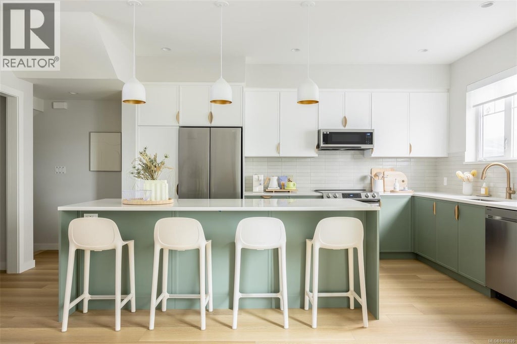 With both nature and modern-life essentials nearby, Willow + Glen by award winning Abstract Developments is ideally situated for balanced, vibrant living. This bright 3 Bed, 2.5 Bath + den home showcases expansive windows, 9’ ceilings and 20’ wide main living floor that allows light to shine throughout 1,438 sq ft of serene living space. The spacious gourmet kitchen fits the whole family, featuring a large island, woodgrain cabinetry with gloss quartz countertops, built-in storage solutions and Smart Samsung stainless-steel appliance package. Designed with two private outdoor spaces and an extra room perfect for movie nights or hosting guests. Bodman Park at Willow + Glen nurtures community and connection with seating, playground and dedicated dog area. Other conveniences include side-by-side car garage & in home cooling. Located in the heart of Langford and minutes from Glen Lake, the Galloping Goose & shopping amenities. Price + GST, first-time buyers are eligible for a rebate. (id:6289)