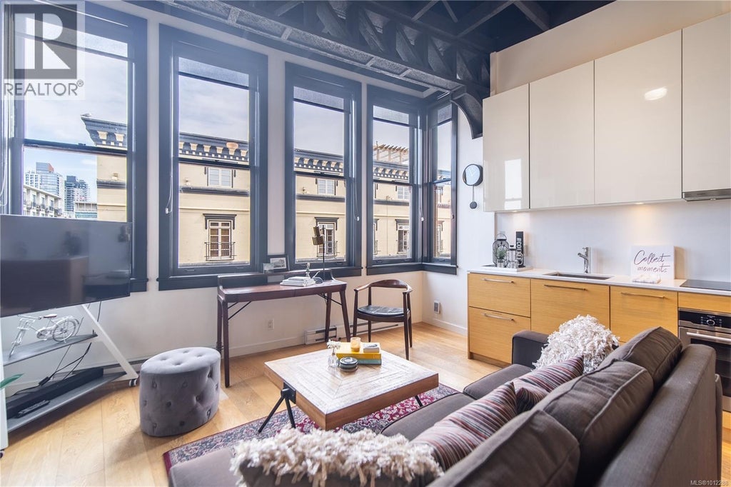 Soaring 12-foot ceilings, exposed wood beams, expansive 8-foot windows set the stage for this remarkable 2-bed, 2-bath residence in the heart of Victoria’s vibrant downtown. Bathed in natural light from dual front and side exposures, the great room offers both openness and privacy—without neighbouring units looking down into the suite. Every detail has been thoughtfully designed: wide-plank floors, stone counters, sleek European appliances, and custom finishes that seamlessly blend heritage character with modern comfort, black frame trimmed windows. The open layout is enhanced by a Murphy bed, custom closet organizers, and blinds for added functionality, while both bathrooms feature walk-in showers and medicine cabinets. Comfort and convenience are assured with air conditioning, in-suite laundry, and a cool, contemporary design. Residents enjoy access to a fully equipped gym, a welcoming lounge, and the choice of two elevators or the beautifully restored original stairs. With private entries from both Store Street and Pandora Avenue, the building captures the best of history and modern living. Step outside to cafés, dining, the Inner Harbour, and all the vibrancy of downtown at your doorstep. This is a rare opportunity to own a home that combines architectural presence, premium finishes, and an unbeatable central lifestyle. Contact Christian to book a viewing on this property 778-678-3098. (id:6289)
