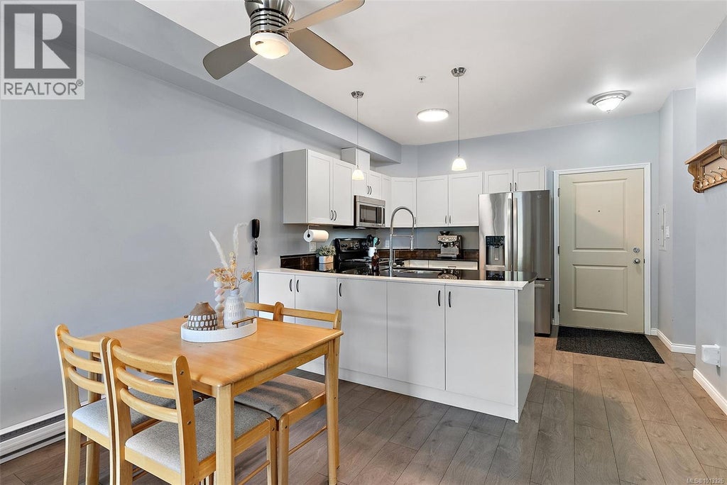 South-facing 2BR/2BA condo offering comfort, convenience & excellent value. Bright, open layout easily accommodates dining & home office spaces, with a private deck perfect for morning coffee or evening relaxation. Features include in-suite laundry, generous kitchen storage & a walk-in closet in the primary. Two pets of any size welcome! Set back from Goldstream Ave, this quiet home has a reasonable strata fee covering water, hot water, insurance, management & maintenance. Steps to groceries, shops, restaurants, parks, transit & schools. With the new hybrid university campus now open nearby, this is a prime choice for students, homeowners or investors alike. Move-in ready in a well-managed, pet-friendly building. (id:6289)
