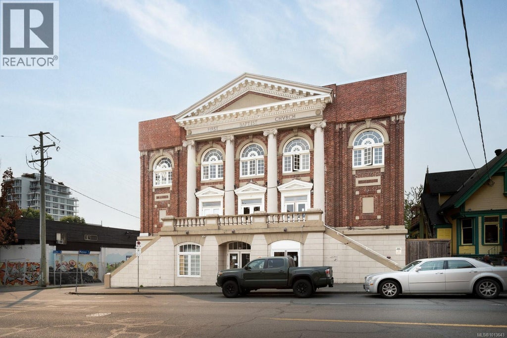 Stunning wooden beams, soaring ~18' vaulted ceilings, and the most beautiful windows in this two story top level loft that feels like a penthouse! Welcome to The Palladium. A heritage conversion with character and style. This home offers open living/dining, a flex bedroom/office, and full bath on the main, a lofted primary retreat with ensuite + walk-in. Upgrades include a sleek glass-door shower and premium designer fan. This heritage jaw dropper comes with in-suite laundry, secure bike storage, and a stunning rooftop that's made for BBQs and sunsets. The building is pet friendly and rental friendly, and has proven long-term investment income, along with past historical short term rental eligibility. Optional furnishings make this an easy turn-key purchase. Cafés, theatres, groceries at your doorstep, with bikes, transit, and car-share all close by. This is where volume, light, and lifestyle meet — a rare chance in the heart of Victoria. (id:6289)