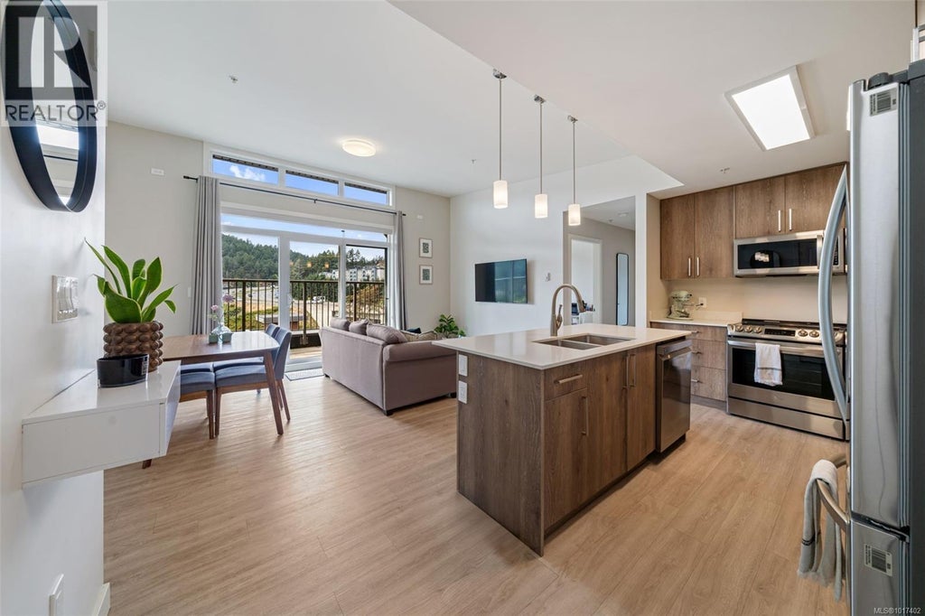 Open House Saturday Oct 18, 11AM-1PM, Sunday Oct 19, 12PM-2PM! Top-floor west-facing 2 bed + den, 2 bath condo at Thetis Lakeside! Offering 1,055 sq. ft. of bright living space, this home features soaring 9’ vaulted ceilings that go up to over 11' with extra windows for natural light, plus an oversized deck with views to the Olympic Mountains. The open concept layout includes a modern kitchen with quartz countertops & stainless appliances, flowing to a spacious living/dining area. The primary bedroom boasts a large walk-in closet & space for an office/reading nook, while the 2nd bedroom also has a generous walk-in closet. European vinyl plank flooring adds style throughout. Extras include 2 storage lockers & 1 parking stall. Pet-friendly with large dogs allowed (no weight restrictions)! Building offers 2 elevators, dog area, bike storage, e-car spaces & ample visitor parking. Steps to Thetis Lake Park & the Galloping Goose, and minutes to shopping, dining & recreation. Rentals allowed! (id:6289)