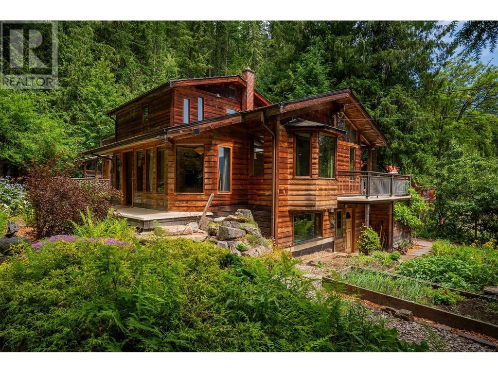 Privately located in Upper Kaslo, this 4-bedroom, 3-bathroom home offers warmth, space, and flexibility. Timber frame details, vaulted ceilings, and mountain views give it character, while the well-designed layout includes a bright living room with fireplace, a large kitchen with walk-in pantry, and a dining area that opens onto a sunny 24’ x 13’ deck. A separate-entry suite with kitchenette adds rental or guest potential. Upstairs, the primary bedroom features a private balcony, plus there’s another bedroom, bathroom, and a bright den or office. The lower level includes a family room, bedroom, bathroom, laundry, cold storage, and more. Sitting on two parcels totalling 0.57 acres, the yard is beautifully landscaped with fruit trees, perennials, raised beds, a firepit, wood shed, powered workshop, chicken coop, and circular driveway with ample parking. Just minutes from downtown Kaslo, this is a private and peaceful place to call home. (id:6289)