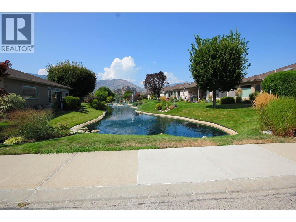 Welcome to prestigious Sandbridge, a sought-after gated community featuring stunning waterways, lush landscaping, and a charming clubhouse with a hot tub and pool. This 1,374 sq ft rancher is move-in ready. Enter through the foyer to an open living and dining area with easy-care laminate floors, abundant natural light, and ample space for your furniture, creating a warm, inviting atmosphere. Enjoy tranquil views of foliage and waterway from your living room window whenever you wish. An adjacent door leads to a spacious utility room with extra storage and garage access. The home boasts a generous primary suite with a walk-in closet and a 4-piece ensuite, along with a guest bedroom and a main bathroom with a walk-in shower. The renovated kitchen features modern cabinets, white appliances, and room for three at the counter. A cozy family room with a gas fireplace provides the perfect space for relaxing evenings. The family room opens to a private, east-facing covered back patio and yard—ideal for outdoor entertaining. Conveniently located near shopping, trails, parks, the beach, pubs, Skaha Lake, and the seniors center, all within a friendly, well-managed community. (id:6289)