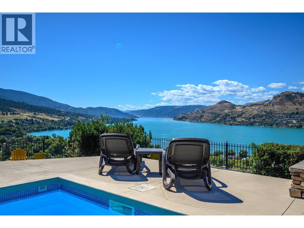 Perched above the ever changing waters of Kalamalka Lake, this 4-bedroom, 3.5-bath executive home offers an unparalleled 270 degree view over the lake, the surrounding hills and mountains. Set in a quiet bare-land strata community, the property is designed to celebrate its extraordinary setting—indoors and out. A custom concrete pool with spacious pool deck and attached sundeck creates an outstanding outdoor living space perfect for summer days and evening entertaining. Inside, the open-concept main level showcases an island kitchen with granite counters, stainless steel appliances, breakfast bar, and solid hardwood floors, open to the spacous dining and family rooms. Soaring vaulted ceilings and expansive windows frame the views, while sliding doors open to a lake-facing sundeck. The king-sized primary suite features an updated ensuite with soaker tub, separate glass shower, and a beautifully crafted custom walk-in closet. A versatile flex room on the main could serve as a second bedroom or an impressive home office. The lower level is designed for connection and fun, with a spacious rec room, cozy bar area, and direct access to the covered patio and pool deck. Two large bedrooms make it a perfect retreat for teens or guests. Additional features include a detached double garage with garden suite and storage below, plus ample on-site parking. A rare opportunity to live in a thoughtfully designed home where every detail maximizes both comfort and breathtaking natural beauty. (id:6289)
