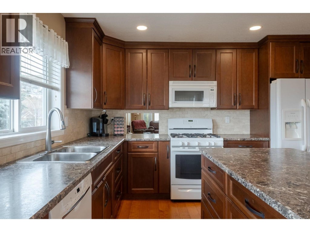 Bright & Spacious Middleton Ridge Home with Stunning Views! Welcome to this beautifully maintained 4-bed, 3-bath home on sought-after Middleton Mountain. Featuring vaulted ceilings, an open floor plan, and breathtaking city and mountain views from the covered deck, this home is a must-see. The large island kitchen offers plenty of counter space, while the dining and living areas flow seamlessly to the deck—perfect for entertaining or relaxing. Four full bedrooms include a spacious upper-level room ideal as a guest suite, office, or playroom. A large storeroom in the basement can easily be converted into a fifth bedroom for added flexibility. The fully finished walkout basement boasts a huge games room (pool table included!), a large bedroom, and a separate entrance, offering excellent suite potential—either as a rental or shared living while maintaining part of the lower level. Outside, enjoy a private, fenced backyard with lush garden space, mature fruit trees, and grapevines. A 6'9"" x 8'9"" shed provides storage, while extra parking beside the garage accommodates an RV, boat, or other recreational vehicles. Located in a desirable neighborhood just minutes from parks, schools, shopping, and the shores of Kalamalka Lake, this home offers the perfect mix of comfort, convenience, and incredible views. (id:6289)