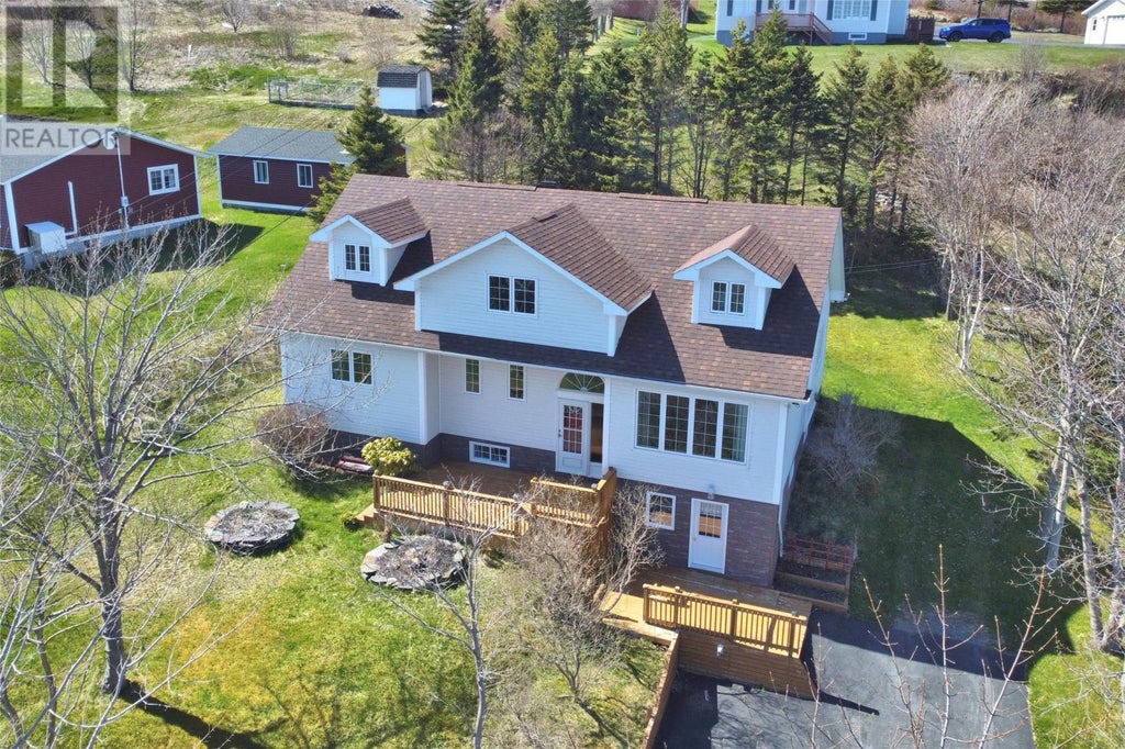 Welcome to 51 Main Road, Upper Island Cove. This 2-storey home has been well maintained an offers a beautiful view of the bay, landscaped grounds, 14' x 20' detached garage, large front deck and spacious back yard. The main floor has a custom eat-in kitchen with appliances included, living room with more water views, three-piece main bathroom and three bedrooms. Provisions have been made to install stairs, but the second floor is currently accessed through a bedroom where you'll find a hobby room, two more bedrooms and a full three-piece bathroom. The basement is highlighted by a large rec room with wood burning stove. Completing the basement is an office, laundry room, storage area and third full bathroom! (id:6289)
