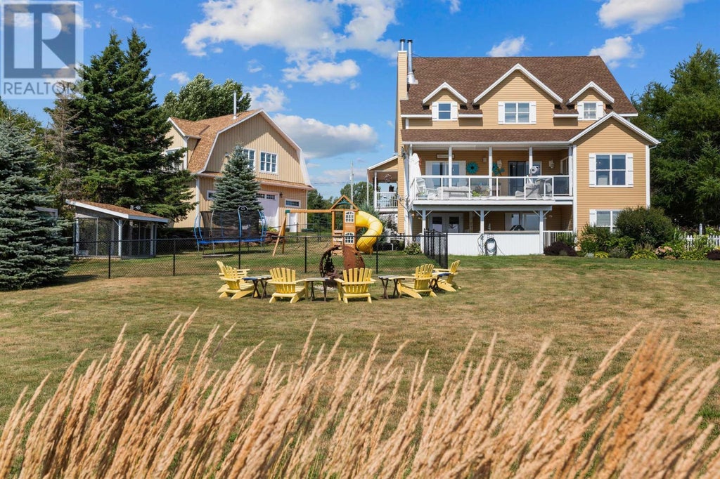Welcome to your dream waterfront retreat on the Southwest River in scenic Margate, PEI. This exceptional estate offers over 8,100 sq. ft. of finished space across two beautifully crafted buildings: a timeless 5-bedroom farmhouse-style main house and a versatile 3-bedroom, 2-bath guest house/garage loft. The main home features vaulted ceilings, a floor-to-ceiling stone Napoleon fireplace, and patio doors opening to a large deck with panoramic river views. The gourmet kitchen boasts commercial-grade KitchenAid appliances, a spacious dining area, and stunning vistas. The main-level primary suite includes a walk-in closet, spa-inspired ensuite with soaker tub, and walk in shower. Upstairs offers a loft-style family room, 3 bedrooms, and a full bath, while the walkout level provides a large living room, gym/games room, bedroom, full bath, and laundry. Outside, enjoy a covered stone outdoor kitchen and serene waterfront setting. Modern upgrades include 3 new heat pumps, in-floor heating on the lower level, electric baseboards, reverse osmosis/UV water system, central vac, built-in speakers, security system with cameras, and a Generac generator powering both buildings. Across the shared drive, the guest house features an attached 4-bay heated garage with custom finishes, heated floors, propane boiler, wood stove, CO2 sensors, boat-sized bay door, gas pump station, and mezzanine storage. Above, a private loft showcases 3 bedrooms, 2 full baths (one with laundry), a chef?s kitchen with imported cabinetry, butcher block counters, and a large island. Finished with barn beams, hardwood barn board flooring, 2 heat pumps, and propane boiler, this space is complemented by two peaceful decks with natural views. Perfect for extended family, guests, or high-end rental potential, this property blends luxury, privacy, and flexibility. A rare island oasis?this is more than a home, it?s a lifestyle. (id:6289)