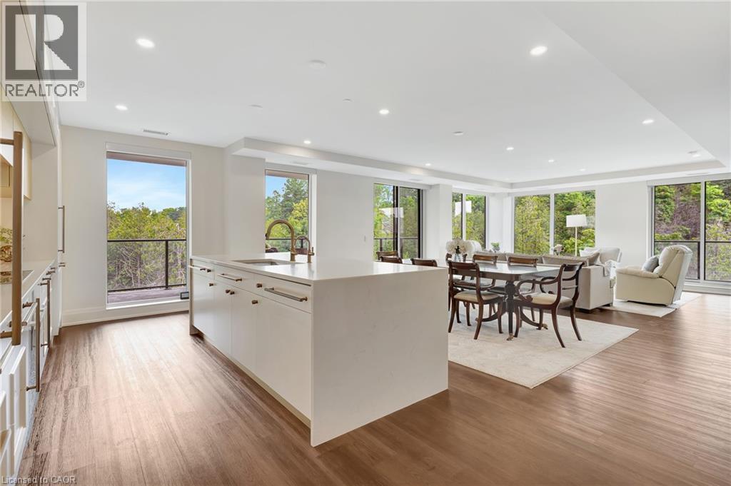 This luxurious 1,979 sqft, 2-bedroom plus den corner suite is in the most desired location in the building. An additional 500 sqft of outdoor living space and wrap-around windows give spectacular views in every season….. stunning water views of the Grand River, Gorgeous Elora Mill and the Scenic Tranquil views of the Elora Gorge. The main living area features a kitchen with floor-to-ceiling custom cabinetry, Upgraded Miele appliances, a large island with a waterfall countertop, and seating for four. The spacious dining room provides ample room for a large dining table perfect for hosting dinner parties or family dinners. The bright living room is open and easily accommodates larger furniture making this suite ideal for downsizers. The impressive primary suite boasts river views, two walk-in closets, and a five-piece ensuite bath with a double vanity, a gorgeous soaker tub with chandelier and a separate shower. This ideal layout also has a second wing with an additional bedroom and bathroom for guests, providing privacy. A spacious den with a door offers a versatile bonus room, perfect for a home office, guest room, or home theater. The Luxury Elora Mill Residences offer resort-style living, complete with a concierge, lobby coffee bar, resident lounge, private dining/party room, gym, yoga studio, outdoor terrace with fire pits, and an incredible outdoor pool with spectacular river views. Just steps from Elora’s charming downtown, you'll find top restaurants, shops, and cafes to explore, as well as quick access to the trails along the Elora Gorge in this amazing walking community. Two underground parking spots and a locker complete this ideal luxury home, offering low-maintenance, resort-style living. (id:6289)