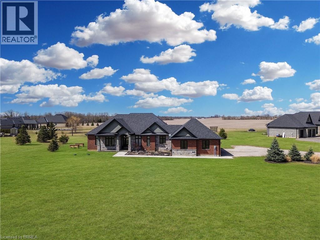 This stunning custom-built brick and stone ranch sits on 1.7 acres in the prestigious Royal Highland Estates. Built just five years ago, this home offers nearly 4,000 sq. ft. of beautifully finished space, including a fully finished basement with a walk-up to the garage—perfect for a potential in-law suite. The open-concept main floor features 4+2 bedrooms and 3.5 bathrooms. The chef’s kitchen boasts ample cabinetry, granite countertops, recessed lighting, and a sprawling island that flows into the living area. A cathedral ceiling and cozy gas fireplace make the living room a warm gathering space, with direct access to a covered deck from both the living room and primary suite. The private primary suite includes a spa-like ensuite with a walk-in shower and a massive walk-in closet. On the opposite side, three additional bedrooms, a full and half bath, and a well-designed laundry room with a walk-in closet complete the main level. With soaring 10-foot ceilings and transom windows, the home is filled with natural light. The lower level features a spacious rec room with large windows, a second gas fireplace, an office/den, two bedrooms, a full bath, and two large storage rooms. The walk-up to the triple-car garage makes this space highly functional. Enjoy peaceful country living with no rear neighbors, scenic farmland views, and stunning sunsets. This quiet, family-friendly area is minutes from Apps Mill, Whiteman’s Creek, and Brantford’s amenities. (id:6289)