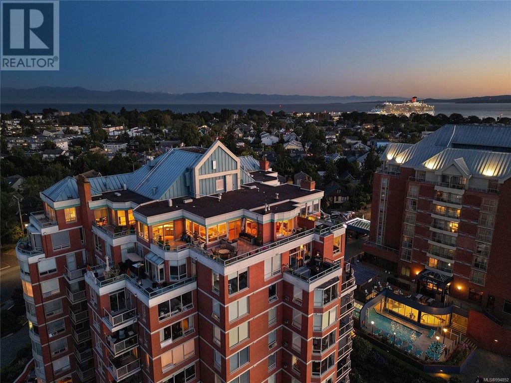 Sweeping, jaw dropping views of Victoria’s acclaimed Inner Harbour. Extremely rare WATERFRONT PENTHOUSE CONDO. This top floor residence offers just over 2600 Sq.Ft. of interior living space ( 2 Beds + Den ) coupled with 4 Deck choices with more than 1100 Sq.ft. providing 360 degree views. Your choice of two front entry ways to brilliant open spaces in your main living/dining/kitchen with heaps of natural daylight. High-end appliances from Wolf, Sub-Zero & Miele compliment the well positioned kitchen with a charming eating nook. Oak H/Wood throughout + stunning tile. 9 Ft. Ceilings. Bedrooms & den are situated on the east wing of the suite providing excellent separation from the living spaces. Relax in your spacious primary suite with its stunning 14’ vaulted ceiling & power blinds. Summertime happy hours will be the envy of the neighbourhood with all your outdoor space. Steel & Concrete Building. 2 side x side parking stalls. Seaside walk paths below + quick access to all amenities in the James Bay and Inner Harbour area. This is a unique and one of a kind condo. Live above it all here at The Harbourside Penthouse Collection. Ask your realtor to secure a private viewing. (id:6289)