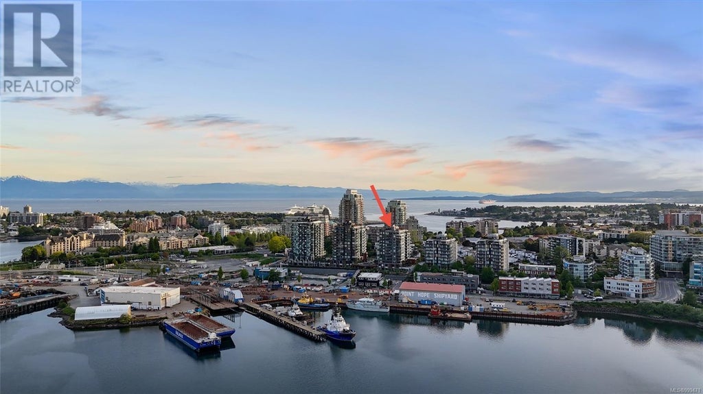 Live above it all in this stunning 2 bed, 2 bath suite at Dockside Green, one of the greenest developments in North America. Nearly new and barely lived in, this home offers ocean and sunset views, a bright open layout, and luxury vinyl plank flooring throughout. The chef’s kitchen features a gorgeous marble backsplash, top of the line appliances and quartz counter tops. Enjoy a spacious dining area and sunlit living room, perfect for entertaining or relaxing. The primary suite has a walk-in closet and spa-like ensuite with a no-step shower; the second bath includes a deep soaker tub. The building offers a world-class gym, rooftop patio with gas fireplace, 3 BBQs, a social lounge, pet wash, bike repair & storage rooms. Includes 1 secure parking spot with EV charging, 1 storage locker, BBQs allowed, & 2 dogs of any size. Steps to the Galloping Goose Trail, Songhees Walkway, Boom + Batten, Il Terrazzo, shops, pubs & more. This homes combines luxury, lifestyle & in an unbeatable location. NO GST! (id:6289)