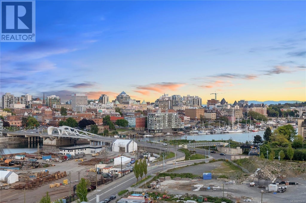 Introducing a luxurious 2-bedroom, 2-bathroom suite at Dockside Green by BOSA Development. Built in 2023 and still under warranty, this stunning home boasts sweeping views of Victoria, Mount Baker, the Empress, and the ocean, all from a private 174 sq ft balcony. The chef’s kitchen features a quartz island with seating for four, gas range, statement marble backsplash, and ample cupboard space. The spacious primary suite includes a walk-through closet and spa-inspired ensuite with a no-step shower and double sinks, while the second bathroom offers a deep soaker tub. Enjoy a state-of-the-art gym - one of the best in the city, a rooftop patio with 3 BBQ areas, a gas fireplace and plenty of space to relax and soak up the sun, pet wash, social lounge and secure bike storage. Just steps to Galloping Goose Trail, a 5-minute walk to Il Terrazzo, Boom + Batten, the Songhees Walkway & downtown’s finest restaurants. Includes 1 parking space, storage locker, allows 2 dogs with no size restriction. (id:6289)