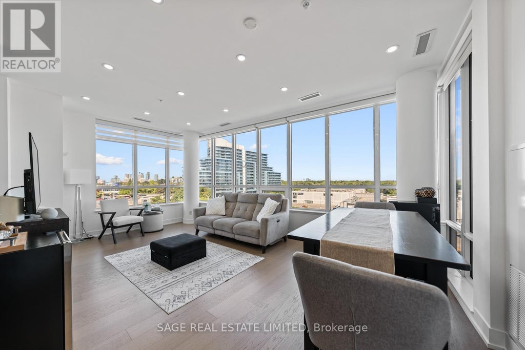 A rare corner retreat at Lotus Condominiums - designed for those who want space, light, and a daily dose of sunsets. Measuring over 1,000 sq.ft., this 2-bed + den, 2-bath suite feels more like a home than a condo. Thanks to wrap-around windows, the interior is drenched in natural light by day and framed by unobstructed northwest views by night - perfect for catching spectacular sunsets. The split-bedroom layout creates privacy, while 9-ft ceilings, smooth-finished (popcorn-free) ceilings, and ample potlights enhance the open, airy feel. The kitchen was built to impress with stainless steel appliances, quartz countertops, and a centre island with an extendable table - seamlessly blending cooking, dining, and entertaining. The living/dining area offers plenty of room to gather, while the separate den features a custom desk and shelving - ideal as a home office, nursery, or guest room. The spacious first bedroom is paired with a 4-piece bath. The primary suite steals the spotlight with its own balcony, a walk-in closet with custom organizers, and a 3-piece ensuite complete with a walk-in shower. An additional balcony extends from the den for quiet moments outdoors. Storage is never an issue thanks to a same-floor locker, and parking is included. At Lotus, you'll enjoy boutique mid-rise living with just 234 suites and amenities that include a rooftop deck, gym, party room, concierge, and visitor parking. Completed in 2019 by Chestnut Hill Developments, the building offers the perfect mix of modern convenience and intimate scale. Located across from Bayview Village Shopping Centre and next to Bayview Subway Station, the address puts the city within easy reach - whether you're commuting downtown or escaping north via the 401 or DVP.Modern design, thoughtful upgrades, and a lifestyle of convenience - this suite has it all! (id:6289)