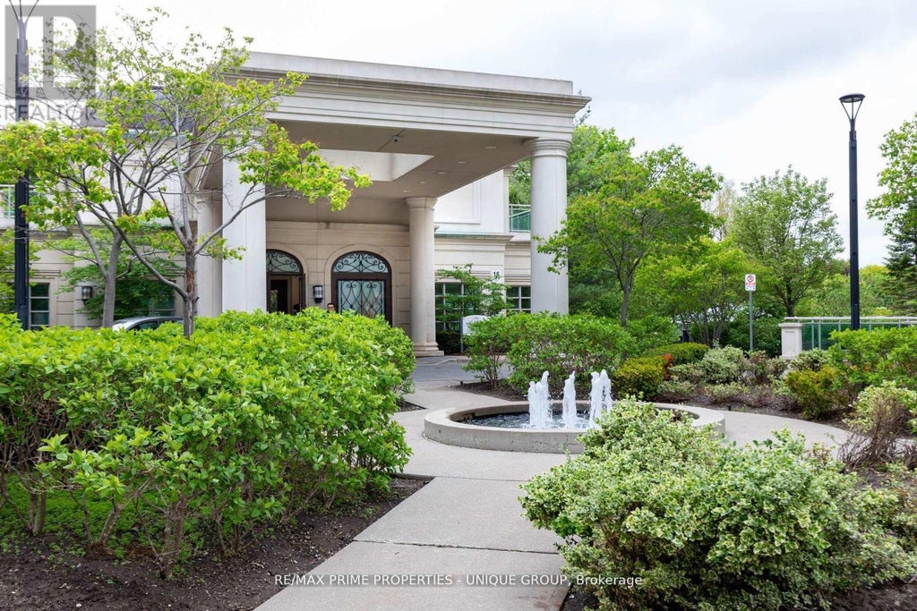 Spectacular renovation in sought after luxury building. This stunning 1,205 sq. ft. corner suite with a desirable split bedroom plan has been exquisitely renovated. The sun filled 2 bedroom plus den is situated on a quiet cul de sac and boasts soaring 9 ft. ceilings, pot lights and a welcoming foyer with large double closet. Dream kitchen features quartz counters, premium stainless steel appliances and breakfast area with a walk-out to a large balcony with panoramic views of the ravine. The open concept living and dining areas centre around a contemporary fireplace wall. Spacious primary bedroom with his and hers floor to ceiling built-in closets. The spa inspired ensuite features a glass enclosed rain shower and separate soaker tub. Second bedroom features a double floor to ceiling built-in closet, bay window with a tree top ravine view, and has an adjacent 3-piece bathroom and separate laundry closet. The versatile den can accommodate a variety of uses. Custom built-ins throughout the unit provide for ample storage. The unit includes one underground parking spot and one walk-in locker. Residents of the Aria community enjoy an impressive array of lifestyle amenities including 24 hr concierge service, indoor salt water pool, gym, library, media room, party room with billiards and ping pong tables and a virtual golf simulator. Conveniently located close to the subway, Bayview Village, North York General Hospital, and great schools. (id:6289)