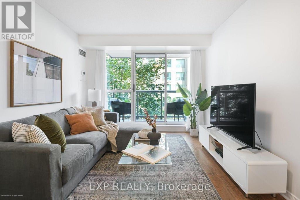 Tucked quietly across from the storied stalls of the St. Lawrence Market where the scent of fresh bread mingles with the hum of community this warm, welcoming two-bedroom, two-bathroom residence offers a rare blend of modern comfort and historic charm. Located in a discreet low-rise that blends seamlessly into one of Toronto's most iconic neighbourhoods, the home feels like a well-kept secret: just steps from some of the city's best cafes, green spaces, and cultural landmarks, yet quietly removed from the city's rush. Inside, the space opens up generously. Floor-to-ceiling sliding glass panels flood the main living and dining area with soft, natural light, drawing the eye toward a lush, tree-lined courtyard a canopy of green that transforms with the seasons and offers a peaceful backdrop year-round. The layout is intuitive and functional, with a distinctly home-like feel thats increasingly rare in todays market. Both bedrooms are large enough to comfortably accommodate king-sized beds, a testament to the intelligent design.The kitchen and bathrooms have been thoughtfully updated, marrying contemporary finishes with timeless appeal. Its a space that feels instantly livable not just a place to stay, but a place to belong.Beyond the suite, residents enjoy access to a concierge (perfect for the modern delivery lifestyle), a rooftop deck with sweeping views for summer entertaining, a well-equipped gym, party room, and more. Here, in the heart of the city, where cobblestone streets meet café culture and historic architecture meets modern convenience, this home offers something rare: a true sense of place. Seller has rented a parking space within the building for 14 years; additional parking may be available for rent (subject to availability and third-party arrangements) (id:6289)