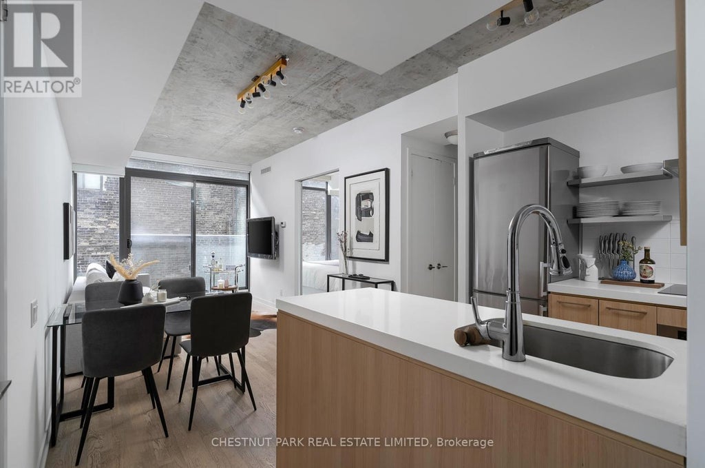 Boutique Living on Adelaide's Quieter Side. Across from the landmark Waterworks Food Hall and the park, this boutique Fashion House condo offers a refined take on downtown living. A sunlit 1-bedroom plus den is framed by floor-to-ceiling windows and a Juliet balcony, filling the home with a soft, natural glow. The flexible den adapts effortlessly-ideal as a home office, reading nook, or intimate guest space-while the bedroom delivers serene proportion, comfortably accommodating a king-sized bed with generous closet space. Open living and dining areas flow seamlessly into a sleek, well-appointed kitchen|, balancing form and function for both entertaining and everyday ease. Residents enjoy access to a rooftop pool, gym, and party room, infusing a touch of resort living into this intimate building. Steps from Toronto's best dining, transit, and cultural destinations, this residence defines urban living, refined. (id:6289)
