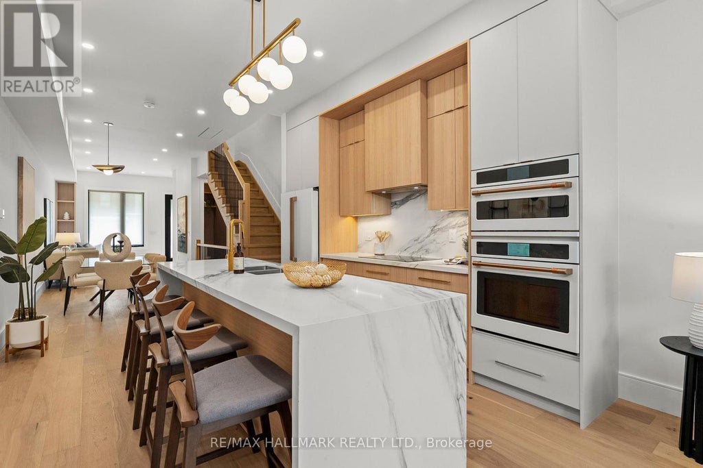 Step into this newly built 4+1 bedroom, 5-bathroom semi-detached residence at 46A Pape Avenue, where contemporary design meets everyday comfort across three thoughtfully designed levels. The open-concept main floor is anchored by a chefs kitchen featuring premium Decotech cabinetry with maple plywood interiors, a striking waterfall countertop, and an oversized island that doubles as the perfect spot for casual meals, family gatherings, or homework sessions. Prewired for both security and smart home technology, the home is future-ready and built with peace of mind in mind. Upstairs, spacious bedrooms provide privacy and relaxation, while a second-floor laundry room with custom cabinetry and deep utility sink adds efficiency to daily life. The crown jewel awaits on the third floor: a private 700+ Sqft primary retreat with soaring 10-foot ceilings, a spa-inspired 5-piece ensuite, and a generous walk-in closet. The finished lower level offers remarkable versatility with a bright additional bedroom, full bath, and walk-out access to a private patio - perfect for a guest suite, home office, or in-law setup. Outdoors, the detached garage goes beyond expectations with dual access, a dedicated 100-amp panel, EV charger, and Wi-Fi-enabled openers. The pull-through design allows seamless extension of the backyard or extra parking as needed. This residence is more than a home - its a lifestyle upgrade, delivering modern elegance, family functionality, and East End convenience in one exceptional package. OFFERS ANYTIME! (id:6289)