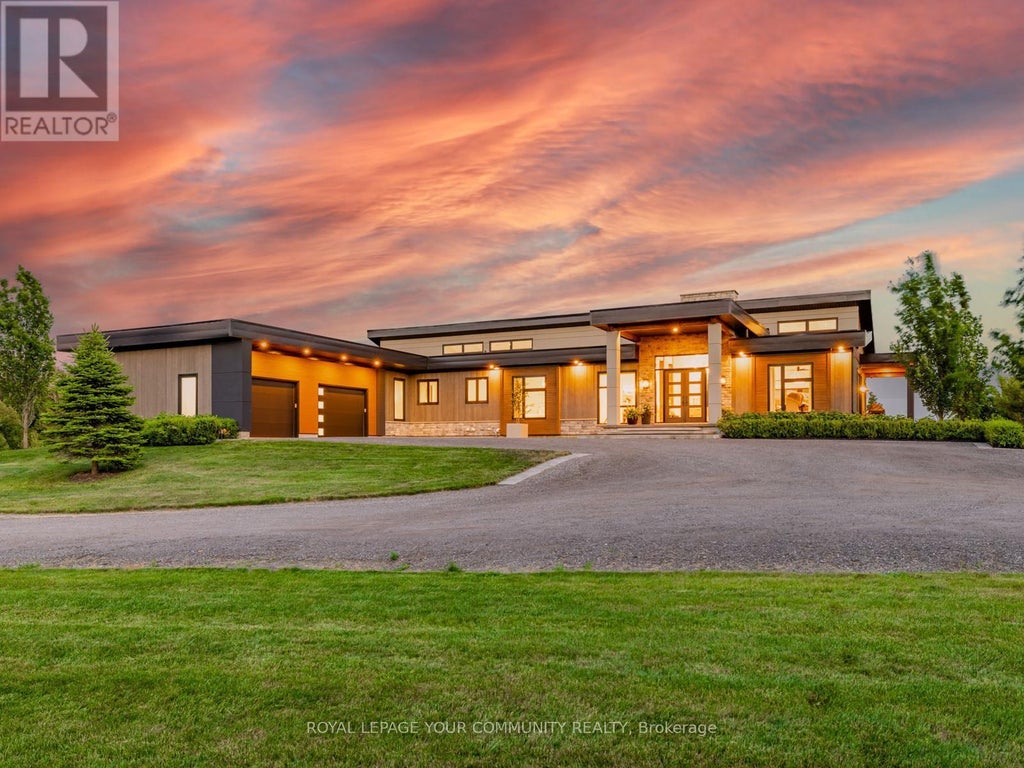 Welcome To 807 Ganton Road. This Stunning 4 + 2 Bedroom, 5 + 1 Bathroom Ranch-Style Bungalow Offers Over 7,200 Sq. Ft. Of Finished Living Space On A Picturesque 9.3-Acre Lot. Inside, You'll Find Soaring 18-Foot Vaulted Ceilings, White-Oak Flooring, And A Thoughtfully Designed Layout Filled With Natural Light And Scenic Views Of The Surrounding Farmland. At The Heart Of The Home Is A Chefs Kitchen Featuring A Massive 12.5-Foot Quartz Island With Seating For Six, Custom Adamo Cabinetry, A Built-In Thermador Fridge And Freezer, Two Built-In Jenn Air Beverage Fridges, A Breakfast Bar, And A Butlers Pantry Equipped With A Second Sink And Built-In Dishwasher Ideal For Both Entertaining And Everyday Convenience. The Kitchen Opens To A 3-Season Sunroom Overlooking Rolling Fields, Offering A Serene Place To Relax. The Spacious Family Room Boasts 18-Foot Vaulted Ceilings, A Cozy Fireplace, Three Walkouts To The Rear Deck, Automatic Window Coverings, And Panoramic Views Of The Property. The Primary Bedroom Is A True Retreat With Vaulted Ceilings, A Fireplace, A Walkout To The Deck, Two Walk-In Closets, And A Luxurious 5-Piece Ensuite With Double Vanities. The Walkout Basement Is Designed For Entertaining, Featuring A Full Wet Bar With Ample Cabinetry, A Bar Fridge, A Keg Fridge With Built-In Tap, And A TV. You'll Also Find A Dedicated Home Theatre With Built-In Surround Sound, A Professional Office, And A Spacious Gym. A Separate 2-Bedroom, 1-Bathroom Coach House Adds Extra Living Space Perfect For Guests, Extended Family, Or Potential Rental Income. Included is a 22 Kilowatt Generac Generator That Ensures The Home Never Experiences A Blackout. Current Zoning Allows For Home Occupation or Home Industry. Just Minutes From Town, This One-Of-A-Kind Estate Blends Luxury and Privacy In A Truly Exceptional Setting. (id:6289)