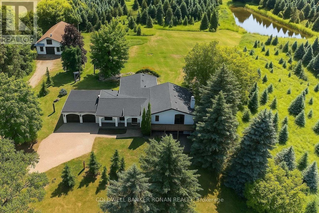 Located just above Highway 9, minutes from Hwy 9 and Airport Road this 25 acre retreat like setting features rolling treed landscapes, ponds and a 3 bedrooms, 4 bathrooms 4 level side split taken back to the studs and fully remodelled. This designer finished home offers bright and spacious living, multiple walkouts, stunning finishings and fixtures all brand new and never lived in! Upper level with 2 bedrooms with ensuites. Main level features an open concept living room and kitchen with breakfast bar and sunken eating area, mud room, laundry and half bath. Walkout lower level with wood burning fireplace, 3rd bedroom and four-piece bath. From the private tree lined drive to the koi pond overlooking the spring feed pond and enchanting panoramic views of mostly blue spruce creates picturesque scenery all year round. The 25 ft x 45 ft barn could be used for animals, storage for recreational vehicles or both. (id:6289)