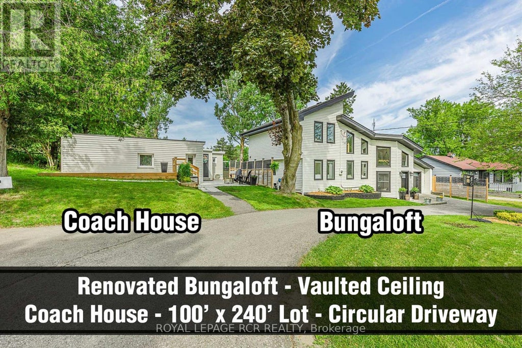 Wow Designer renovated vaulted ceiling Bungaloft and cute separate full service coach house! The completely separate and renovated 1 bedroom full service Coach House offers room for extended family or possible rental income Enjoy the "you would have to see it to believe it" recent $350,000+ renovation featuring modern and stylish finishes throughout, this home is gorgeous! Escape to your private sanctuary, conveniently located within a couple of minutes to downtown Uxbridge. This exceptional bungaloft residence offers unparalleled privacy on a sprawling, maturely treed lot. Step inside to a grand entryway featuring soaring ceilings, custom built-in wooden benches, and a striking two-sided fireplace. The heart of the home boasts a warm and stylish open-concept living space, illuminated by expansive windows and showcasing wide plank oak flooring, elegant decorative paneling, and a chef's dream kitchen with quartz countertops and premium appliances. Retreat to the secluded family room, a haven of tranquility with a walkout to the yard, an electric fireplace, and shiplap detailing. The luxurious private primary suite, located on the upper level, features vaulted ceilings, dual closets, and a spa-inspired ensuite with in-suite laundry. The two additional main-level bedrooms provide flexible living options. The finished basement offers a guest bedroom, playroom, and a recreation room with a live-edge bar. Outside, enjoy a fully fenced yard with a new deck and hot tub. A charming, self-contained coach house adds versatility, featuring a bedroom, bathroom, kitchen, living room, private laundry, updated HVAC, new electrical, roof and deck. The convenient circular driveway ensures effortless parking. A must see, bring your relatives! (id:6289)
