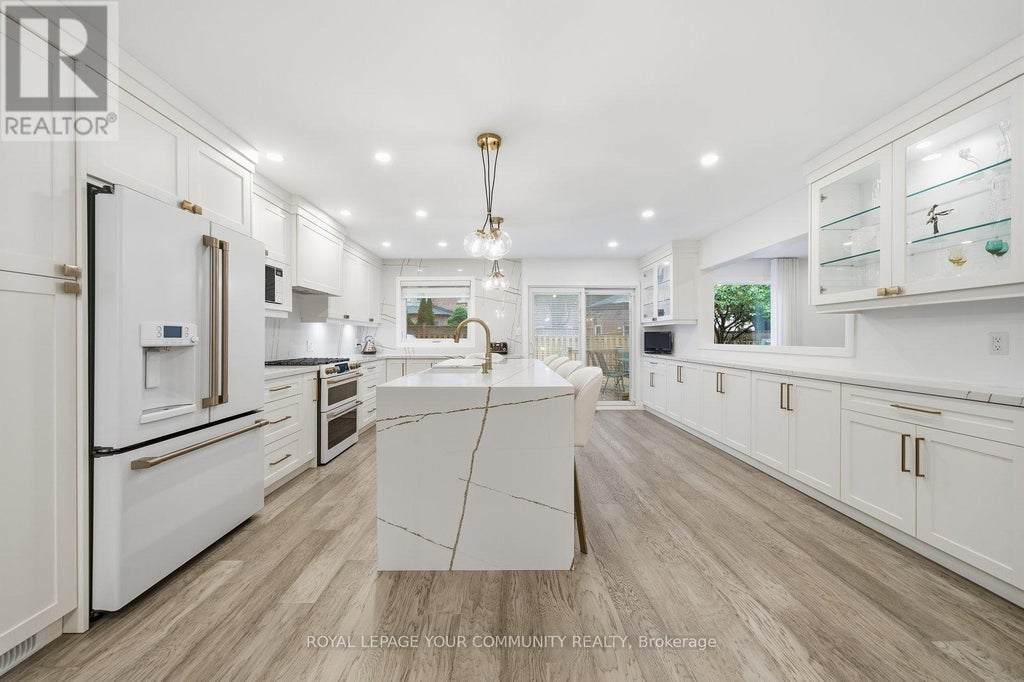 A Bright and Luxurious Residence in the Heart of Thornhill. This elegant, renovated family home blends timeless design with modern luxury. Filled with natural light, it showcases exceptional craftsmanship, custom built-ins, and high-quality finishes throughout. The stunning designer open concept kitchen features a stunning GE Cafe Series gas stove, built in dishwasher and fridge. Elegantly styled quartz backsplash, countertops, and island, complemented by built-in glass cabinetry and a custom pantry-where style meets function. The master bedroom offers a serene retreat with a spa-inspired ensuite complete with a luxurious soaker tub. The fully finished basement extends your living space, featuring a bedroom, spacious recreation room, and a full four-piece bathroom-perfect for guests or family. With five bedrooms in total and beautifully appointed living areas, this home perfectly balances comfort, functionality and sophistication. Walk-out to your meticulously landscaped and maintained back and front yards and enjoy outdoor living on your spacious deck and pie shaped yard. The perfect balance of luxury and lifestyle; situated only steps away from Parks & Rec Centers extends your recreational opportunities for tennis, skating, swimming, jogging, baseball, basketball and even the Playhouse Theatre! In Prime, sought-after Thornhill location, your new Home is also a walk to top schools Ventura Park P.S., Wilshire, and Westmount Collegiate, minutes to daycares, shopping, transit, and everything a great community has to offer! (id:6289)