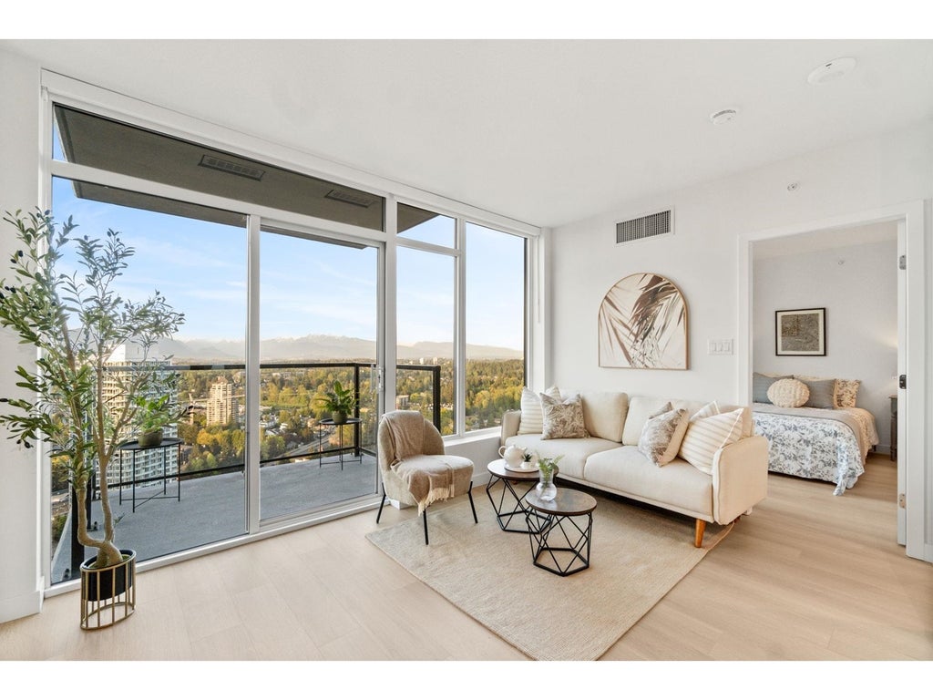 Stunning 40th-Floor Condo with Unobstructed Mountain & City Views . Your dream home in the sky awaits at Plaza One -King George Hub! This bright, modern condo offers breathtaking panoramic views from every room, thanks to floor-to-ceiling windows that flood the space with natural light. The open-concept layout features sleek integrated appliances for a seamless, upscale look .Located just steps from King George SkyTrain, Save-On-Foods, Starbucks, and more - everything you need is right at your doorstep .Includes 1 parking, 1 storage locker, and strata fees cover electricity & heating .Resort-style amenities: rooftop lounge, gym, yoga room, theatre, games room, co-working space & more! (id:6289)