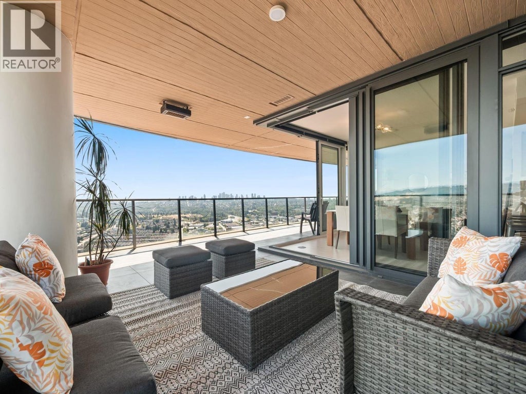 Sub-penthouse at Concord Brentwood Hillside East with unobstructed, 270° views from the mountains & Indian Arm to Mt. Baker to Metrotown then all the way to the Gulf Islands! This south facing, 2 bedroom, 2 bathroom corner suite offers 1,059 sqft of modern living plus an incredible 638 sqft of heated outdoor space. Expansive, corner sliding doors fully open to seamlessly blend indoors & out-expanding your living space and perfect for entertaining. Morning coffees and evening glasses of wine have never had it so good! Sleek, contemporary design & open layout with quality finishings & air conditioning. The complex offers exceptional amenities, 24/7 concierge, and is just a short walk to vibrant Brentwood Mall & Skytrain. One parking & storage locker included. (id:6289)