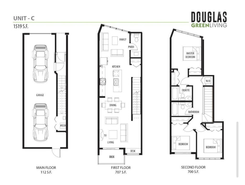 Douglas Green Living - assignment of contract. Rare 3 bed, 3 bath townhouse (1,519 sq.ft.) in Pacific Douglas. Features bright open-plan living, quartz kitchen w/ stainless steel appliances, laminate floors, and family room on main. Upper floor includes spacious master w/ ensuite, 2 additional bedrooms, laundry, and bath. Tandem double garage, balcony & private patio. Complex has clubhouse, playground & visitor parking. Completion est. 2025. GST applicable. Measurements from floorplan - buyer to verify if important. Taxes not yet assessed. (id:6289)