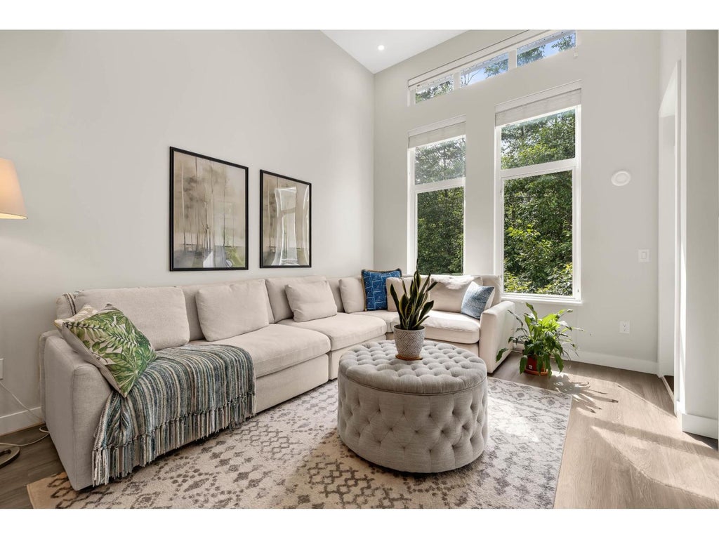 Penthouse living at Headwaters Club! This custom-built top-floor 3 bed, 2 bath home is the largest in the complex, backing onto a lush greenbelt with vaulted ceilings and a massive patio with gas hookup-ideal for relaxing or entertaining. The open-concept interior features all-white cabinetry, an extended quartz island, stainless steel appliances, and custom drawers. The expansive primary suite includes a 6-piece spa-style ensuite with heated floors, under-cabinet lighting, double sinks, walk-in shower, and a freestanding soaker tub. Upgraded MYSA smart thermostats, vinyl plank flooring, 3 parking stalls, and 2 storage lockers. Amenities include a fitness centre and business lounge. Close to Morgan Crossing, shops, schools, Hwy 99, and White Rock Beach. 2 Pets Allowed (Dogs & Cats)! (id:6289)
