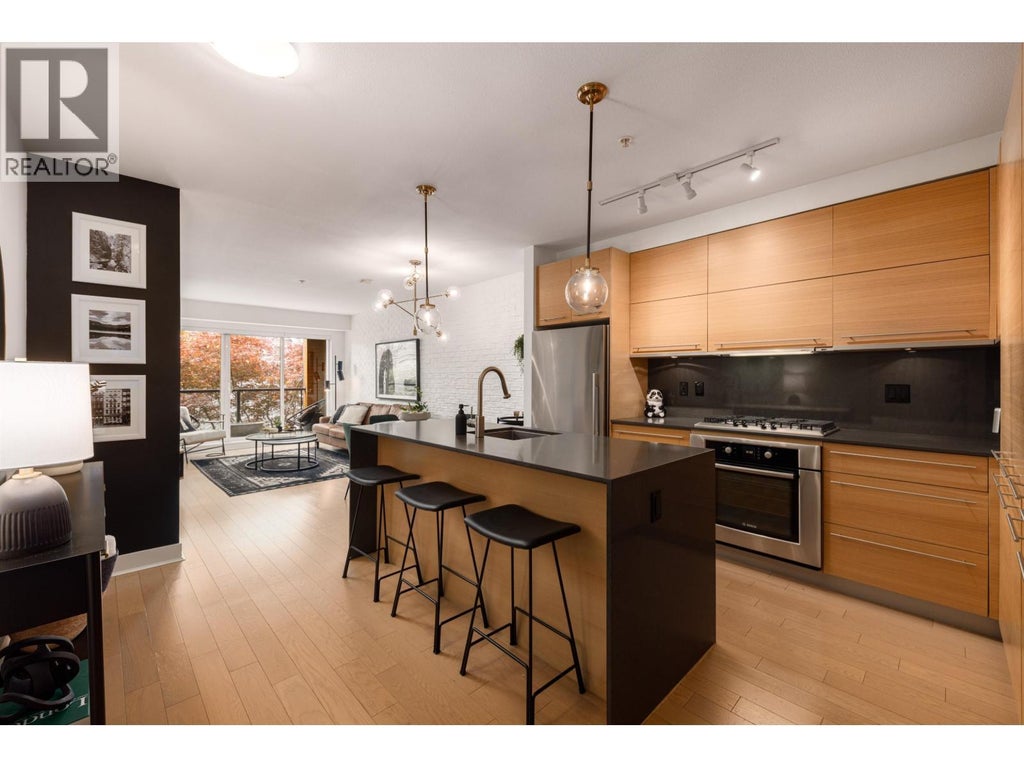 Tucked away on the quiet side of the building, this stylish and spacious Kitsilano one-bedroom + den offers a modern, New York-inspired vibe. Thoughtfully designed with an open layout, a generous den perfect as a second bedroom or office, plus a flex space for storage, fitness, or work-from-home. The large, well-appointed kitchen features stone countertops, stainless steel appliances, and plenty of cabinet space. Warm hardwood floors and custom lighting add comfort and style. The king-sized bedroom includes a walk-in closet. The open living area flows to a peaceful, treed outlook with a stunning Japanese maple. Steps to the Arbutus Greenway, parks, cafes, and future SkyTrain. Pet and rental-friendly building with secure parking and storage. (id:6289)
