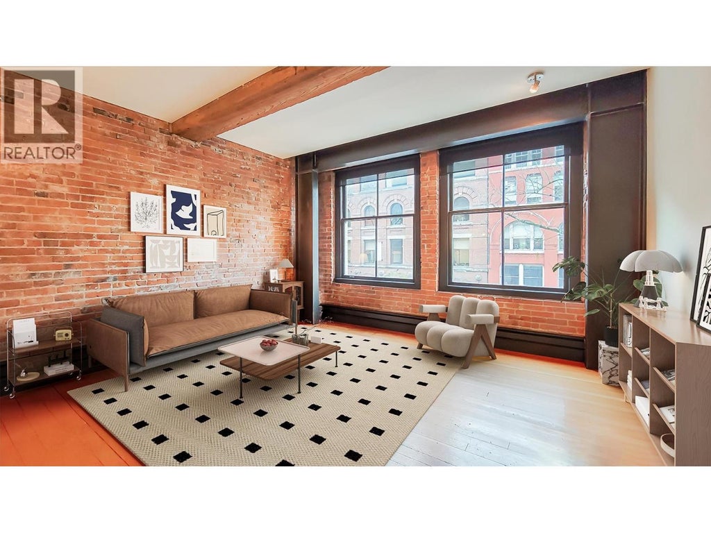 This captivating 812 sqft loft that perfectly blends timeless charm with urban convenience. Featuring original hardwood floors, heritage-style exposed brick walls, and oversized windows that flood the space with natural light, this home is a true gem. Situated directly across from the iconic Steam Clock, this loft offers unparalleled access to all that Gastown has to offer-boutique shopping,restaurants, and the convenience of Waterfront SkyTrain Station, all just steps away. Whether you're looking for a sound investment opportunity or a stunning place to call home, this property checks all the boxes. This is a unique and vibrant piece of Vancouver´s history! 2005 winner of the Award of Excellence for Revitalization. FOUR VIRTUALLY STAGED PICTURE TWO LIVING ROOM AND TWO BEDROOM (id:6289)