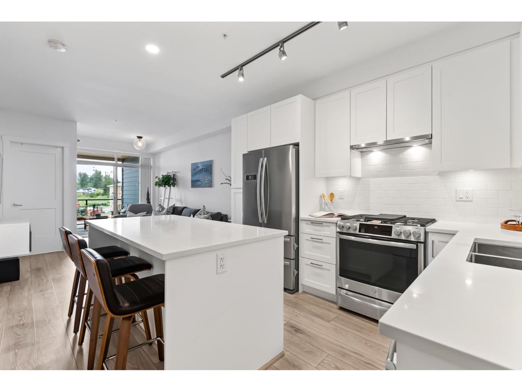 Bright, stylish, and in the heart of Willoughby Town Centre, this 2 bed, 2 bath condo at Grayson checks all the boxes. It's been incredibly well cared for and shows like new. Smart layout with two true bedrooms, sunny south-facing views, and wide plank flooring. The kitchen has a gas stove, stainless appliances, and a big eat-up bar, perfect for hosting. The primary suite features a walk-in closet and sleek en suite with double sinks and heated floors. The second bedroom has a window and works great as a kid's room, office, or guest space. Large covered deck, gym, playground, and social lounge with BBQ and fire pit seating. Includes two parking stalls and a roll-up storage locker. Steps to parks, schools, and shopping. (id:6289)