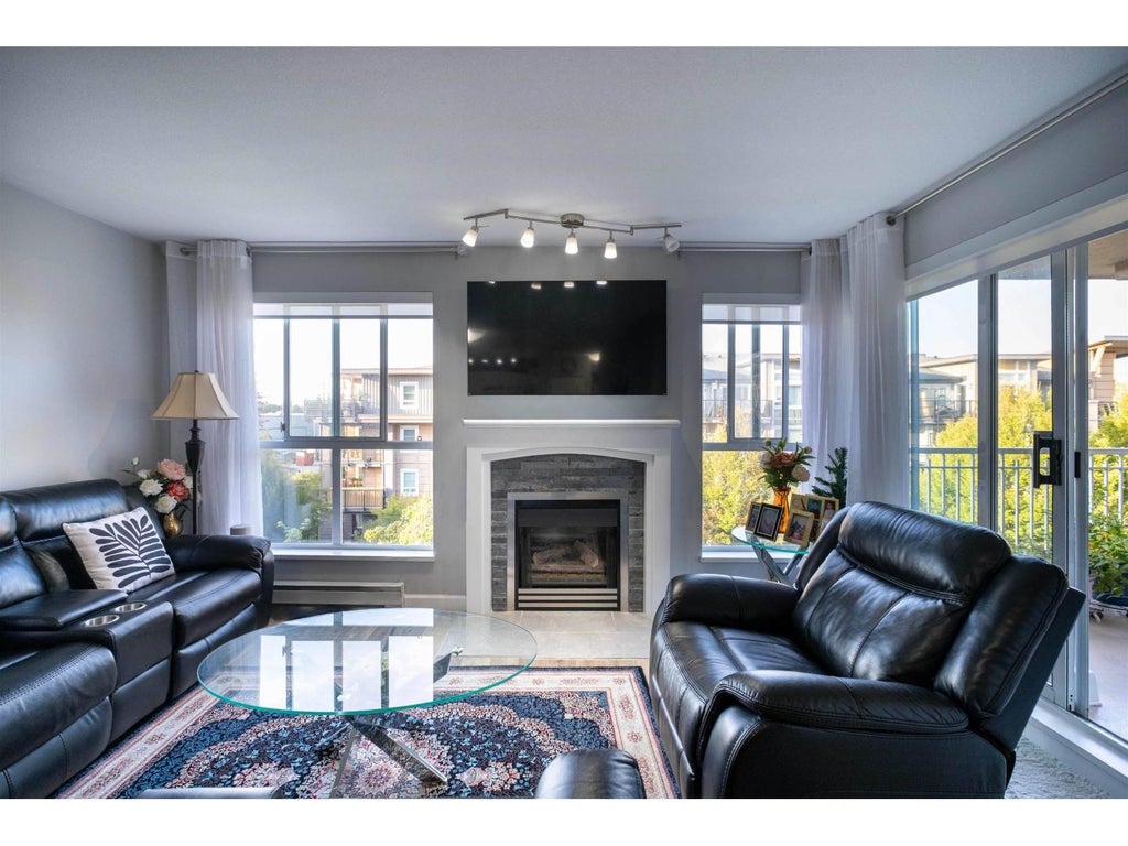 Completely updated 2 bed, 2 bath home with 2 parking! Centrally located and move-in ready, this spacious unit features a large open-concept kitchen with quartz counters, updated baths, cozy gas fireplace, and in-suite laundry. Enjoy an oversized 120 sq.ft. covered private deck with partial views, perfect year-round. Generous rooms fit full-sized furniture with ease. Upgrades include laminate floors, appliances, designer paint, and fireplace surround. Well-maintained complex offers a party room and modern gym, all with a low maintenance fee. Walking distance to Newton Bus Exchange, transit, shops, restaurants, and entertainment! OPEN HOUSE SAT AND SUNDAY 1-3 PM OCT 18 & 19 (id:6289)