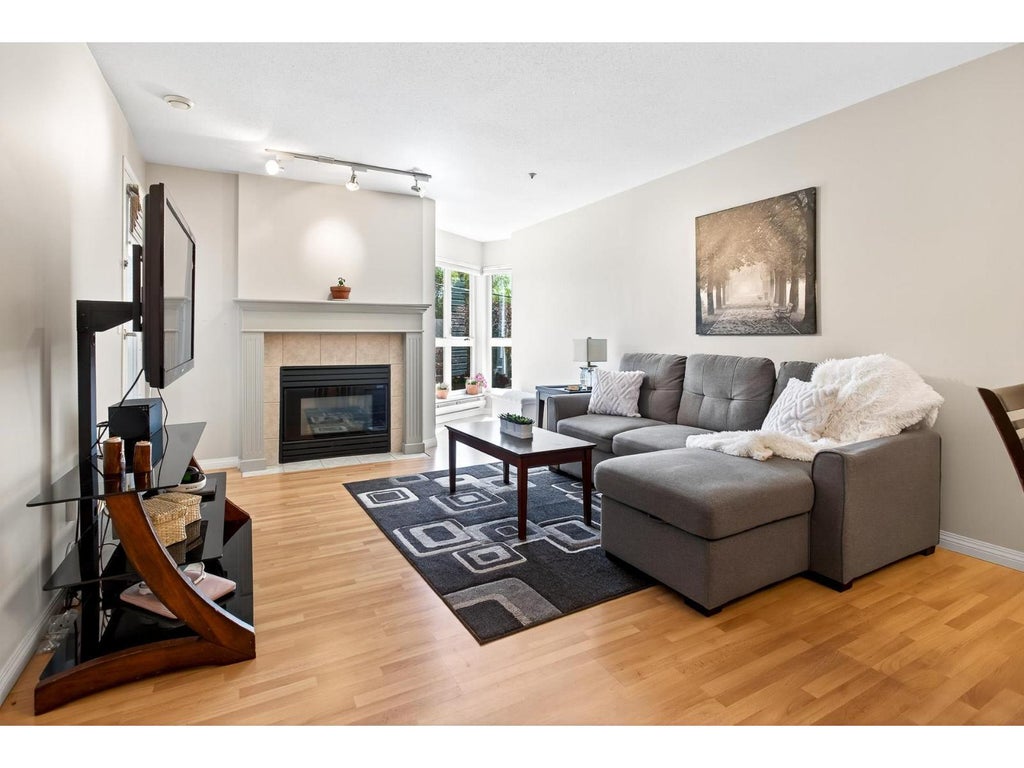 Welcome Home! Imagine stepping into your move-in-ready 1-bedroom haven thats bright, cheery, and tastefully updated with fresh paint, new kitchen tiles, laminate floors, and stainless steel appliances. Enjoy the cheater ensuite, in-suite laundry, and ample storage. Unwind on the massive south-facing patio. Prime location: stroll to future SkyTrain (close yet quiet), shopping, parks, and trails. Healthy strata in a welcoming building with extra street parking. Maintenance covers gas fireplace. Pet-friendly, no age restrictions-best value at 752 sq ft! Won't last-act fast! (id:6289)
