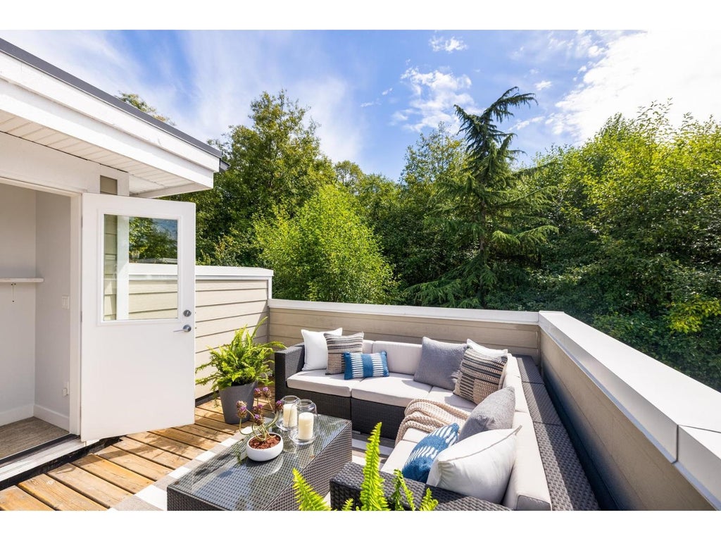 Welcome to The Woods by Gramercy. Check out this rare 3-lvl end-unit TH tucked in a quiet, forested pocket of Grandview, offering 3BRs (+ bonus studio on ground lvl w/sep entrance) & 1754sf of well-designed space, feat. 9' ceils & laminate flrs on main, quartz counters & quality SS appl's. Enjoy a 400+sf sunny roof deck (perf for entertaining, hosting BBQs & all-around summer lounging) + a private south-facing balc. Located in a quieter, back section of the complex, this home offers great privacy & safety for families, backs onto protected green space & the main-lvl studio is ideal for live/work. Dbl tandem garage w/epoxy flrs & extra storage. Clubhouse avail for private events. Close to Morgan Crossing, Hwy 99, beaches & more. You'll feel right at home here! (id:6289)