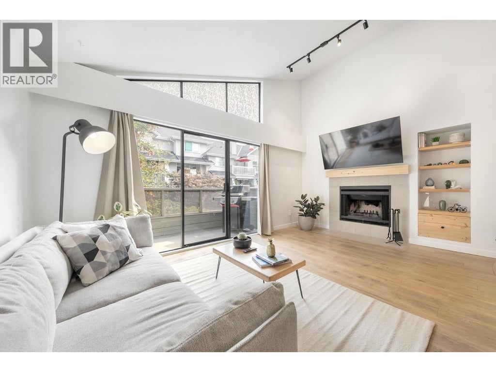 Rarely available top-floor 2-bed, 1-bath corner unit in Uptown New Westminster! This bright home features vaulted ceilings, large windows, recently installed laminate floors with modern baseboards, a stylish kitchen with granite counters and stainless steel appliances, and a cozy upgraded wood-burning fireplace. Bedrooms are set on opposite sides for added privacy, with smart lighting ready for Google or Alexa. Located on a quiet street yet steps from shops, parks, schools, restaurants, and SkyTrain. 1 parking, and 1 storage, heat included in Strata fee, modern, comfortable, and move-in ready! pets allowed (2 cats or 1 dog) (id:6289)