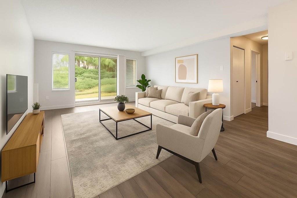Welcome to Langley Village! This tastefully updated 1 bed, 1 bath ground-floor unit is move-in ready and perfect for first-time buyers or investors alike. Enjoy new flooring, fresh paint, updated baseboards, and newer blinds. The walk-out patio backs onto private greenspace-a peaceful spot for your morning coffee or evening unwind. Plus, being on the bottom floor means cooler temperatures in the summer and easy access for pets or anyone looking to avoid stairs. Located close to shopping, transit, parks, and more, this pet- and rental-friendly building is ideal for comfortable and convenient living. Don't miss this opportunity to get into the market at an affordable price! (id:6289)