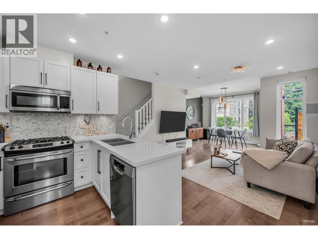 Stunning 3-Bed, 2.5-Bath Corner Townhome in Mount Pleasant! Beautifully designed 3-level corner unit offering 1,408 sf of modern living in one of Vancouver´s most desirable neighborhoods. The home features an open-concept main floor with 9´ ceilings, engineered hardwood flooring throughout, and large windows providing excellent natural light. The contemporary kitchen is equipped with custom cabinetry, quartz countertops, SS appliances, a gas stove, and plenty of storage. Enjoy the private patio on the main level, ideal for entertaining, & a view deck off the top-floor bedroom. Prime location with a Walk Score of 94, steps to parks, shops, cafes, restaurants, and transit. Just a 5-minute drive Downtown. A must-see! Book your private showing. Open House Oct. 19th from 2-3:30pm (id:6289)