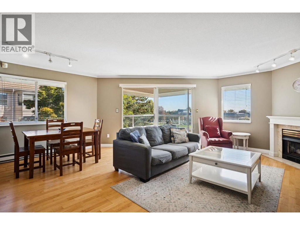 Discover this charming, top-floor floor corner unit 2-bedroom, 2-bathroom condo offering 1204 square ft of living space. Southeast-facing views of the school fields from a covered balcony with lush green exposure is perfect for relaxing or entertaining. The open-concept layout features a spacious living and dining area, ideal for family gatherings with a cozy gas fireplace and electric baseboard heating. The functional kitchen features a breakfast bar, a nook, and a built-in pantry for ample storage. The primary bedroom boasts a skylight in the en suite, tons of natural light, and cork flooring for a soft, quiet feel, while the second bed is large enough for 2! A laundry room with space for storage, as well as a separate locker downstairs, ensures plenty of space for your belongings. Open 2-4pm Oct 25/26. (id:6289)