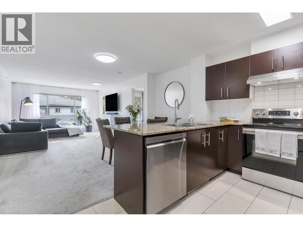 Enjoy this top floor oasis with unique wide layout, separating the two bedrooms for ample privacy. Versatile flex space is ideal for a home office. Modern updates: fresh paint, contemporary fixtures & lighting, upgraded appliances. Step out onto your private, covered patio-an extension of your living space that invites you to enjoy fresh air and tranquil views in any season. Two secure parking spots and a dedicated storage locker. The building offers access to a full gym, amenities room, guest suite, and welcomes pets. Ideally located near the WestCoast Express for quick commutes. Experience the next chapter of your life in a space that truly feels like home! Contact your Realtor to book your private showing today! (id:6289)