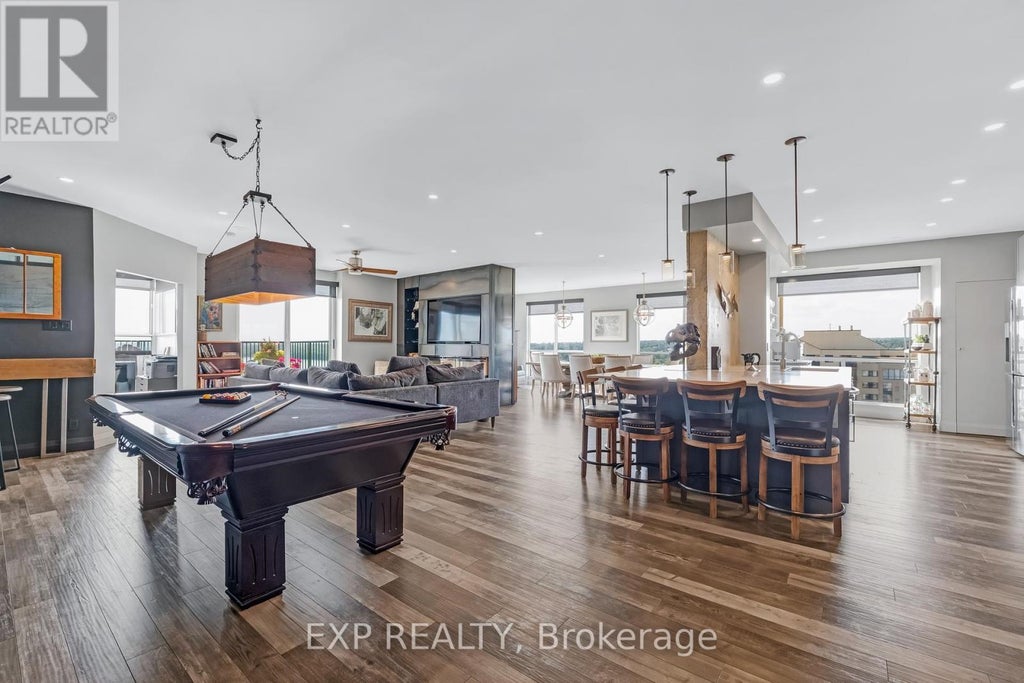 Soaring above Barries waterfront, this 2-bedroom + den penthouse at Marina Bay offers over 2,100 square feet of fully renovated living space with million-dollar views from every major room. Floor-to-ceiling windows frame Lake Simcoe's beauty, while a spacious private balcony becomes your front-row seat to sunsets, fireworks, and the sparkling shoreline. Enjoy unbeatable views of Kempenfest, the Christmas Parade, the annual airshow, and live concerts right from home. The modern industrial design features exposed concrete accents, custom cabinetry, quartz counters, a large island with lots of storage, and premium fixtures throughout. An open-concept layout blends a stunning living area with a built in fireplace, built-in shelving, and custom bar perfect for entertaining. Remote-controlled window coverings, designer lighting, and high-end finishes elevate every detail. The primary bedroom offers a spa-like ensuite with double sinks, stone accents, and a walk-in closet with custom organizers. The second bedroom is generously sized and features its own walk-in closet, while the separate office, with an attached 2-piece bath and stunning lake views, makes working from home a dream. Resort-style amenities include an indoor pool, hot tub, sauna, gym, party room, guest suite, two covered parking spaces, and locker. Just steps to downtown Barrie, the beach, marina, GO station, trails, and dining. This is more than a home..its a lifestyle. (id:6289)