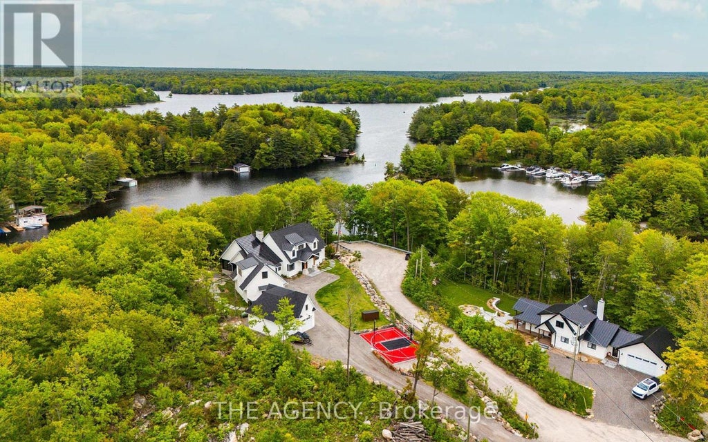 An architectural masterpiece on Gloucester Pool, this stunning waterfront retreat is a seamless blend of modern luxury & natural beauty. Designed by award-winning David Small Designs & crafted by Profile Custom Homes, this year-round sanctuary offers ultimate privacy, impeccable craftsmanship & breathtaking views. Step into the dramatic 2-story foyer, where soaring ceilings & open-concept design set the stage for effortless entertaining. The expansive living space flows seamlessly to a spacious deck featuring an outdoor kitchen & BBQ, perfect for hosting under the stars. A true showstopper, the Muskoka Room boasts a grand stone wood-burning fireplace & beverage station, creating the ultimate space for relaxation. The main level is anchored by a serene primary suite with spa-like 5-pc ensuite & generous walk-in closet. A stylish home office/library, dreamy laundry room & mudroom with built-in pet wash station & thoughtfully designed spaces add to the homes exceptional functionality. Upstairs, four additional bedrooms & two bathsoffer comfort & privacy, while a versatile loft provides extra space for work or play. The lower level is designed for entertainment & rejuvenation, featuring a spacious rec & games area with bar, two additional bedrooms, a full bath, private gym & ample storage. Walk out to a flagstone patio with serene water views, making every moment feel like a getaway. This property is equipped with state-of-the-art mechanicals, net-zero certification with solar & stunning granite pathways leading to a custom-designed sports court. A detached workshop with additional vehicle storage completes this extraordinary offering. Located on the Trent Severn Waterwayjust one lock from Georgian Baythis rare find provides convenient access to golf courses, skiing, shopping, and restaurants. With easy access to Highway 400 and just 1.5 hours from the GTA, this waterfront dream home is an unparalleled opportunity to own a piece of paradise. (id:6289)