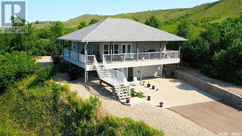 "LAKE life with a VIEW and without WEEDS and all the yard work"...4 bedroom plus 3 bath titled property situated on large corner lot will take your breathe away. Capture the beauty of the Qu'appelle Valley and lakeview from your 2 sided balcony. This 2017 all year round home provides 1665 sq ft on the main floor , has a walk out basement (approx 800 sq ft) with a double heated (in floor heat) (22' x26') garage with direct second level access. From inside this modern and classy bungalow find an open layout dining , living and kitchen that allow you to view the spectacular scenery. The kitchen island will be your favorite work space. There is an induction top , built in oven, large pantry, and many cabinets and counters. 1/2 bath off the side entrance and laundry room which is ideal. Relax in the sitting area with a 3 sided NG fireplace. The one room is currently used as an office but could be your second bedroom on the main floor. Primary bedroom is private and is found at the back (north side) of the home with 2 walk in closets and a huge bathroom with the largest walk in tiles shower. Down to the basement with 9' ceilings, the walk out offers 2 more guest bedrooms, a 4 piece bath, a media room and exercise (flex) area. Access the heated garage on this level and a utility room , great for storage as well. The outdoor area is "Xeriscape" , stunning and easy to maintain. There is a patio area below the balcony with NG hook up for fire table or BBQ and a back entry with stairs to enter the laundry/ mudroom. On the balcony there is 2 NG hookups. Just down the road , a heated single garage in a well treed area is used for keeping the yard equipment and all the "boy toys". This property is TURN KEY and ready for you! Many features to view here ...Must see to appreciate the views and Easy Care lake lifestyle. (id:6289)