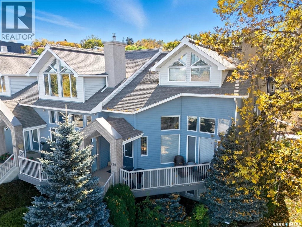 SASK CRESCENT EAST - what an impressive address - overlooks the South Saskatchewan River. This executive townhouse is professionally finished and exudes luxury on all 4 levels. Entering from the covered entry you will be welcomed by a spacious foyer. The formal living room features a gas fireplace, recessed shelving and huge ceiling-to-floor windows which let in tons of natural light. The dining area provides a spectacular view of Saskatoon skyline. Garden door to the west-facing deck. The kitchen has ample cabinets, 5 stainless steel appliances that include a Fisher&Paykel double drawer dishwasher. There is a built-in china cabinet for crystal and a lower-level wine rack. Convenient pantry. The primary bedroom has a walk-in closet, ceiling fan and a 5 piece en-suite with heated floor. The top floor houses a large family room with vaulted cathedral ceiling, exceptionally bright. 4th level has a 2nd family room, guest bedroom and 4 piece bathroom. Large windows make this an inviting area. The 3rd level laundry room has built-in cabinets, LG ThinQ washer, TruSteam dryer, storage closet, utility room, mirrored-door closet and provides direct access to the attached 2 car garage with in-floor heating. This home has engineered hardwood flooring in the foyer, kitchen, dining area and primary bedroom. The 3rd and 4th levels have in-floor heat. Central air, central vac with power head, granite counter tops in the kitchen and in all 3 bathrooms, Hunter Douglas window treatments, keyless entry, reverse osmosis system, underground sprinklers, natural gas barbeque hookup and composite decking, 4 flat-screened attached TVs. Pet-friendly. For an active lifestyle, this home is situated across from Rotary Park, close to trails and within easy walking distance of downtown. This prime unit, with exposure to the west, provides that much sought-after natural light, a second west-facing deck and room for two vehicles on the driveway. (id:6289)