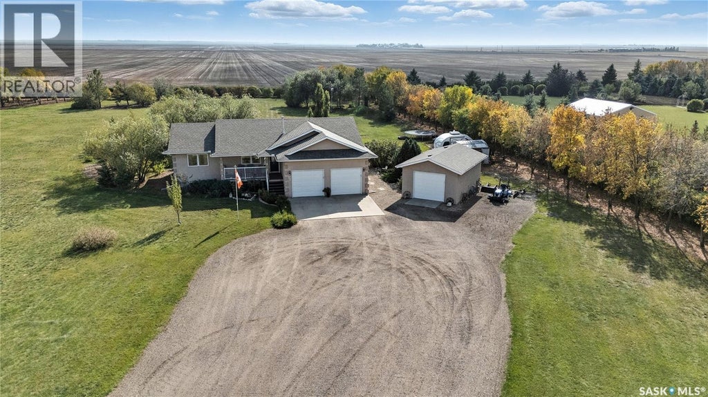 Tucked into Valley Ridge Estates and surrounded by mature trees, shrubs and natural screening! This private 2.77 acre property offers country living, while being only seconds away from Moose Jaw city limits and walking distance to the brand new Coteau Hills elementary school. Built in 2002 and lovingly maintained, this home features a comfortable main floor with an open concept kitchen/dining and living room featuring vaulted ceilings and a gas fireplace. The primary bedroom boasts a generous ensuite with a Jacuzzi tub, standalone shower and a large walk-in closet. Another full bathroom, a separate laundry room as well as an additional bedroom complete the main floor living space. The fully finished lower level is bright and airy thanks to the oversized windows found throughout. A large family room, three additional good size bedrooms and another 4 piece bath with jacuzzi tub complete the lower level. The double car attached garage plus an additional 16’ x 24’ detached garage provide ample storage for all of your toys and equipment. The rear of the home features a large south facing deck and a lower patio area perfect for entertaining or enjoying your hot tub(included). This home is move in ready, the only thing left to do is put your feet up and enjoy the peace and tranquility. Recent updates include shingles (2020), new furnace (2024), hot water heater (2022), new flooring in basement (2017), new flooring upstairs (2019). Property is on Municipal water. (id:6289)