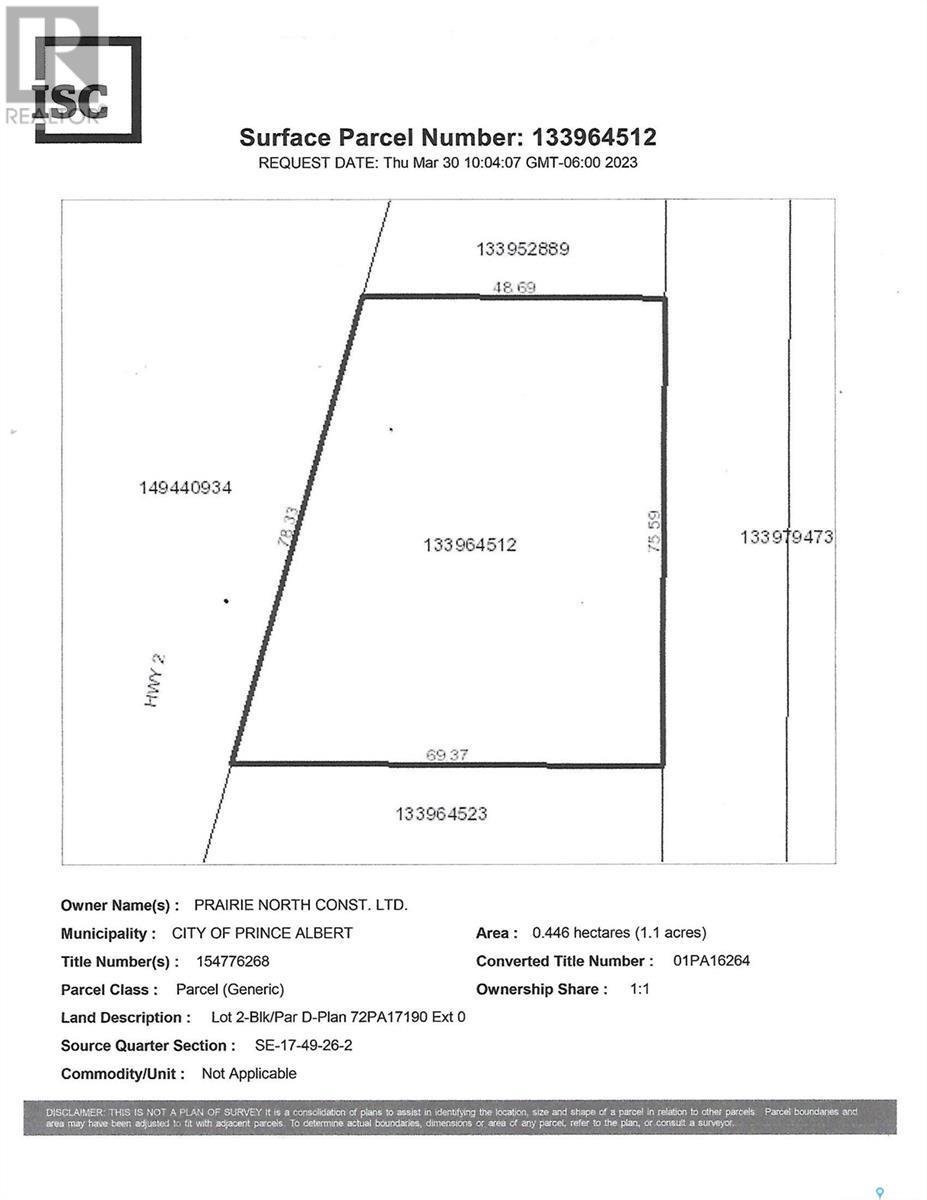 Just 2km's North of the City, is a great 1.1 acre of commercial property to be developed to your desire. With 257 ft. of Highway frontage, an adjacent 4-way intersection with access off highway, leads right to it. Natural Gas, Power, and a, 85' well with great water flow and quality, exists on the property. Also there are 2 bordering parcels North and South that could be purchased from the City to make it a 2.2 acre parcel if required. This location borders the new Nisbet Industrial Park which is being developed. Call your Agent for more details! (id:6289)