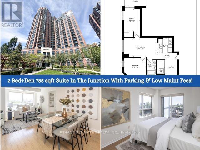 Step into this fabulous 2-bedroom + den condo in the heart of the trendy Junction. This bright and airy unit spans nearly 800 square feet and features a functional, open-concept design. Enjoy abundant natural light from the sunny southeast exposure, which highlights the sleek laminate flooring and freshly painted walls throughout.The modern kitchen is a chefs dream with a custom backsplash. The unit also includes a functional open-concept den with a mirrored closet and a south-facing balcony with deck tiles. This home comes complete with a dedicated parking space and a storage locker. The updated 4-piece bathroom boasts a new vanity with a quartz counter and undermount sink, adding a touch of luxury.This is more than just a home; it's a lifestyle. Located in a top-rated school district, you'll be surrounded by organic grocers, charming cafes, and top-notch restaurants. Enjoy easy access to Stockyards Plaza, High Park, scenic trails, and excellent transit options including the TTC and UP Express.The building is one of the Junction's most sought-after condo communities, known for its strong management and low maintenance fees. The quiet balcony off the primary bedroom is perfect for peaceful mornings.You'll have access to a fantastic array of amenities, including a 24-hour concierge, visitor parking, a party room, a kids' playroom, a BBQ terrace, a gym, a yoga studio, a library, EV charging, bike storage, and more. (id:6289)