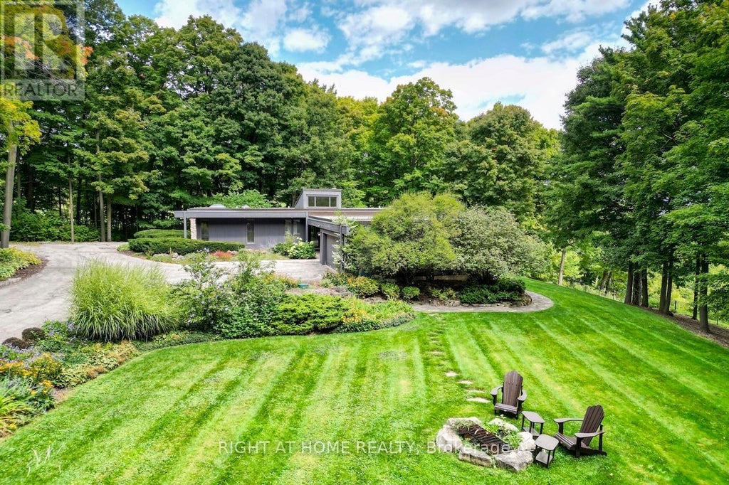 Stunning Frank Lloyd Wright - Inspired Estate with Sweeping Escarpment Views! Perched on the crest of the Niagara Escarpment, this remarkable 3.7 acre estate offers rare privacy, timeless, design and a seamless connection to nature - all just minutes from local conveniences. Blending classic craftsmanship with modern sophistication, the home showcases rich hardwood and natural stone flooring, custom millwork, soaring coffered ceilings and refined crown mouldings. Expansive floor-to-ceilings windows capture breathtaking, unobstructed views, filling every room with natural light. The open- concept design is ideal for both intimate living and grand entertaining, with flowing sightlines from the Great room to the formal dining area and chef's kitchen. Multiple glass-railed terraces extend the living space outdoor, where the escarpment's four-season beauty provides an ever-changing backdrop. Each room has been thoughtfully curated to evoke calm and harmony, offering a true retreat from the demands of daily life. For the equestrian enthusiasts, the property features a manicured paddock with oak fencing and a custom built horse shelter. Outdoor lovers will enjoy direct access to nearby Rattlesnake Point Conservation Area perfect for hiking and exploring nature. This estate is more than a residence - it is a lifestyle defined by beauty, balance and refined country living! ATTENTION BUILDERS: Property has conditional approval for development from the Niagara Escarpment Commission. (id:6289)